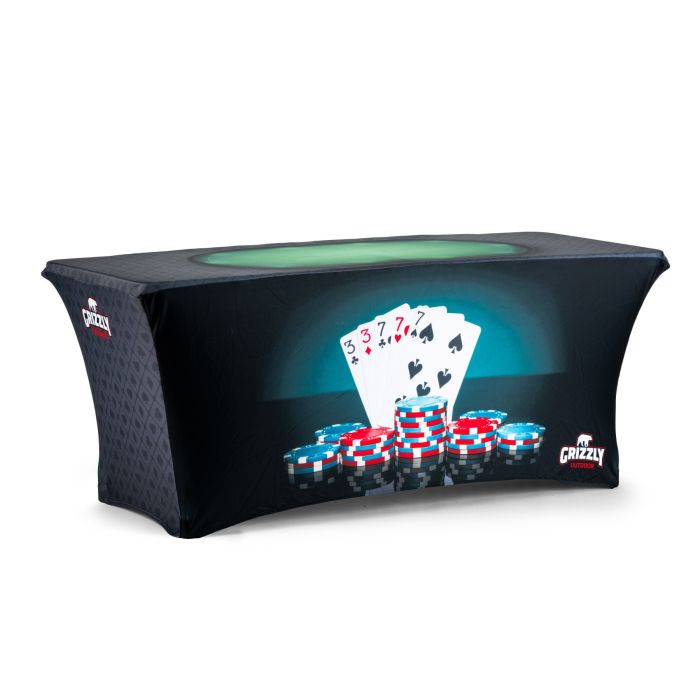 Voeg een vleugje glamour en spanning toe aan je vriendenavond, feest met de Grizzly Outdoor Tafelrok Stretch met Poker Thema en Witte Buffettafel 183 cm.